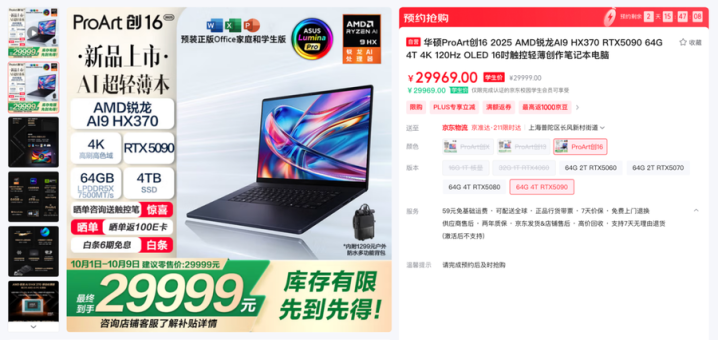 华硕ProArt创162025(RTX5090):https://item.jd.com/100278101128.html